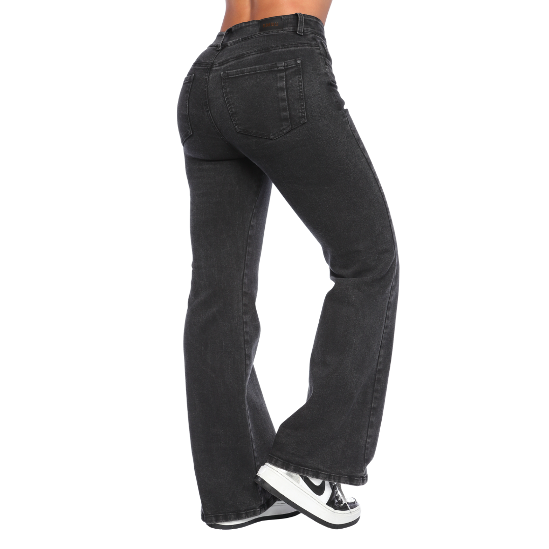 Jean bota ancha, tono gris, con elasticidad, tiro alto, pretina delgada, cotilla trasera, levantacola, cinco bolsillos funcionales. La modelo mide 1.65 y usa talla 8.
