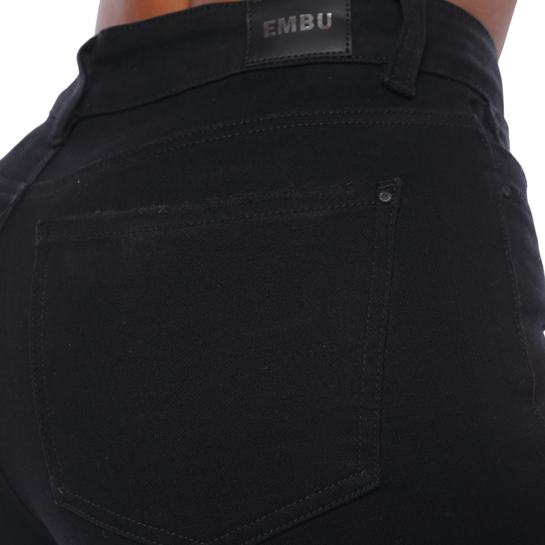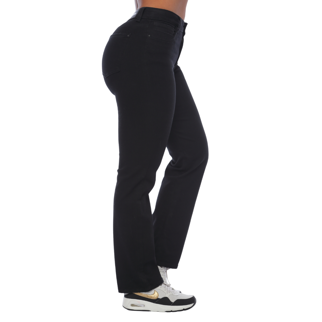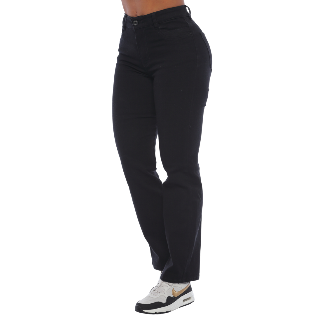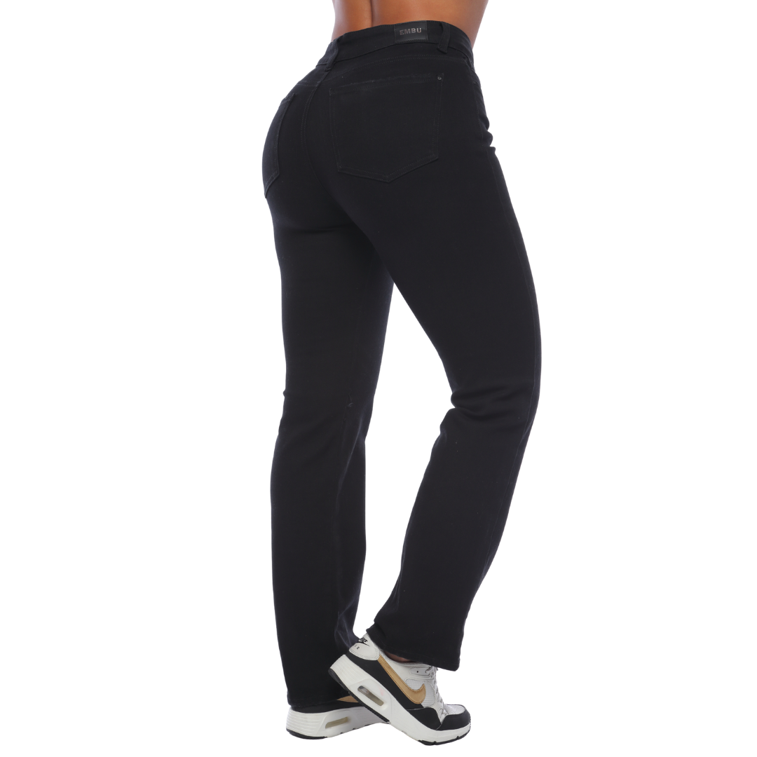 Jean bota recta negro, clásico, con elasticidad, tiro alto, pretina delgada, cotilla trasera, levantacola, cinco bolsillos funcionales. La modelo mide 1.65 y usa talla 8.