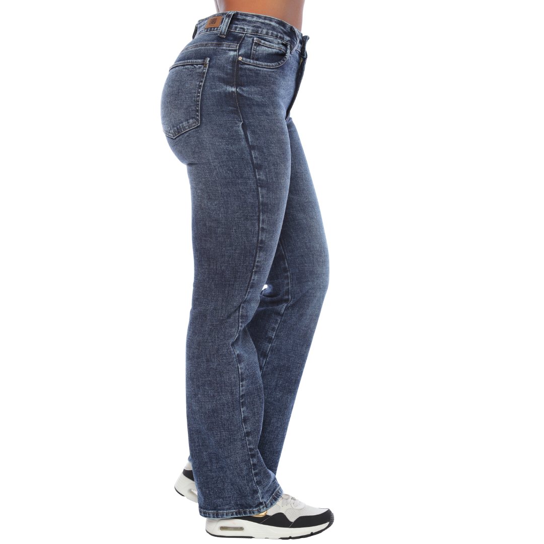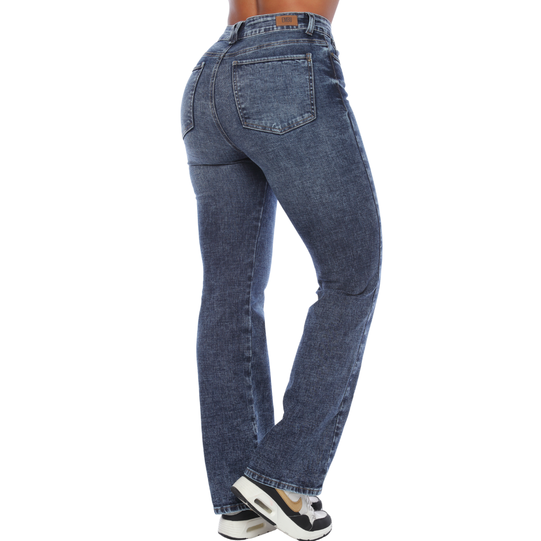 Jean bota recta, con elasticidad, tiro alto, pretina delgada, cotilla trasera, levantacola, cinco bolsillos funcionales. La modelo mide 1.65 y usa talla 8.
