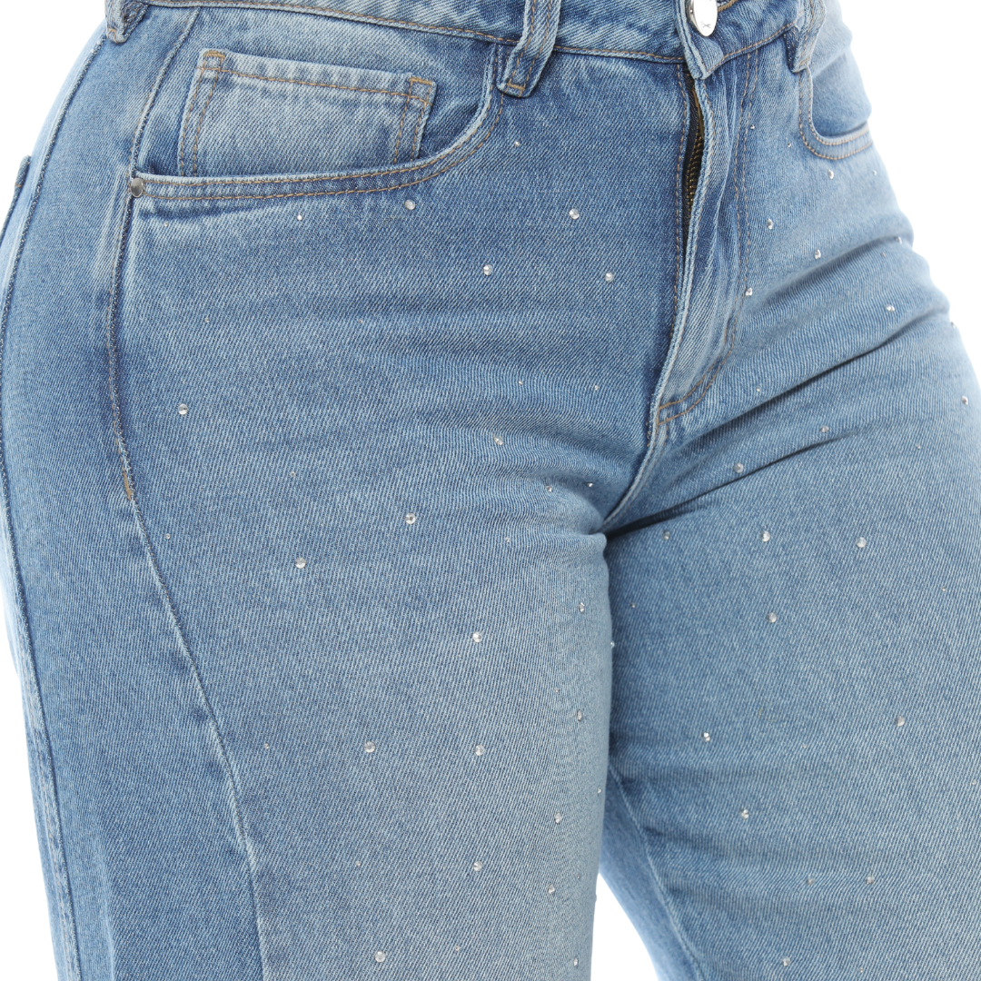 Jean mom flare, rígido, tono medio, con apliques de piedras, tiro alto, con cortes laterales, cinco bolsillos funcionales y funcionales. Composiciones: 100% algodón. La modelo mide 1.65 y usa talla 8.