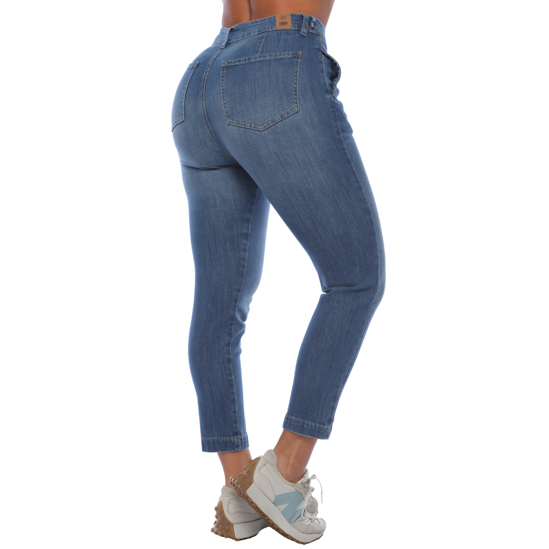 Jean slouchy, tono medio, con elasticidad, tiro alto, pretina con sobrepuesto, pinzas traseras, levantacola, cuatro bolsillos funcionales. La modelo mide 1.65 y usa talla 8.